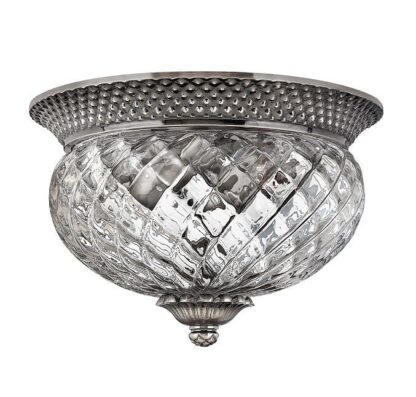Antyczny plafon Plantation z niklowaną oprawą i szklanym kloszem o średnicy 30 cm