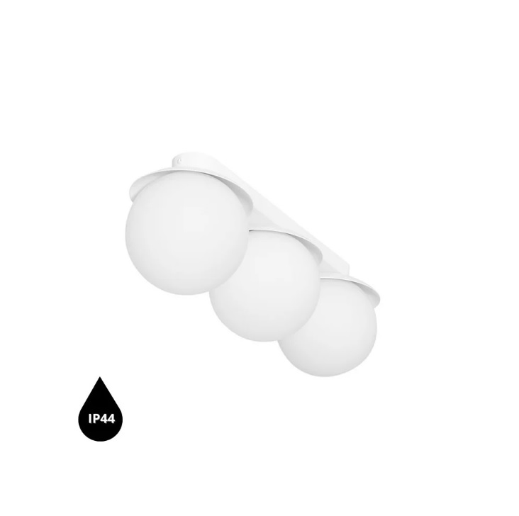 Oprawa łączy metalową, prostokątną podstawę w bieli matowej z trzema mlecznymi, szklanymi kloszami w formie kul, które rozpraszają światło równomiernie w każdym kierunku. Dzięki klasie szczelności IP44 plafon sprawdzi się nad lustrem w łazience, w przedpokoju czy kuchni, a zwarta, liniowa kompozycja pozwala zamontować go również w niższych pomieszczeniach.