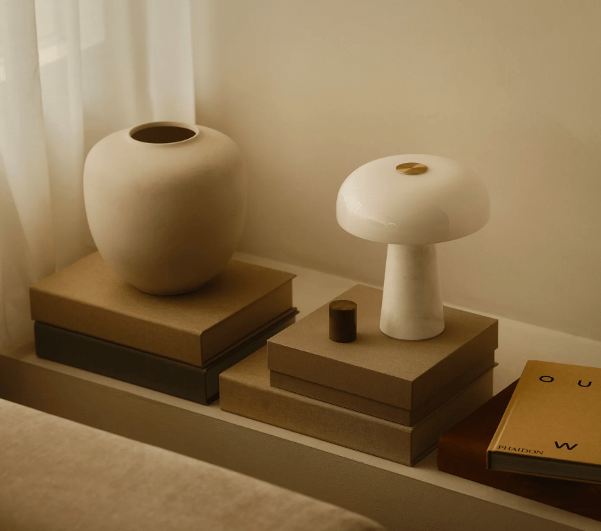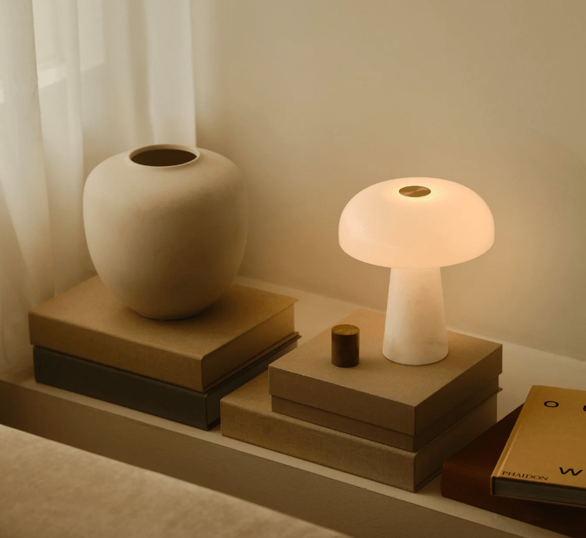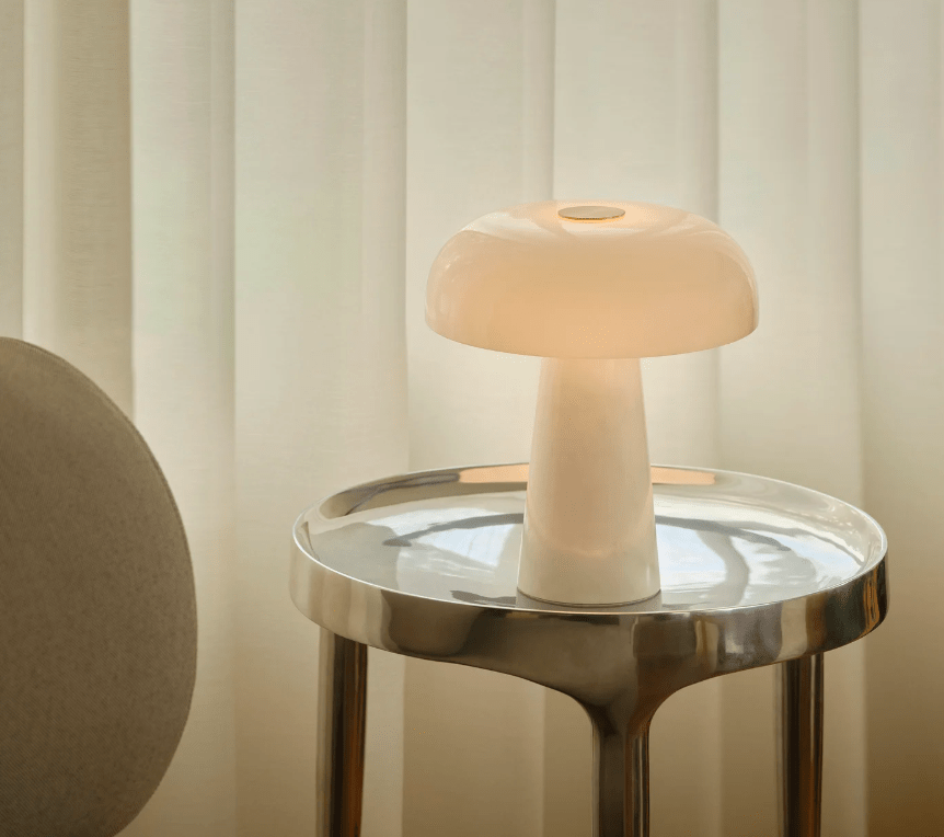 Biała stołowa lampka Glossy Mini od DFTP wykonana ze szkła i marmuru