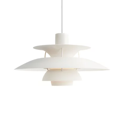 Biała, wisząca lampa PH 5 od Louis Poulsen z metalowym kloszem
