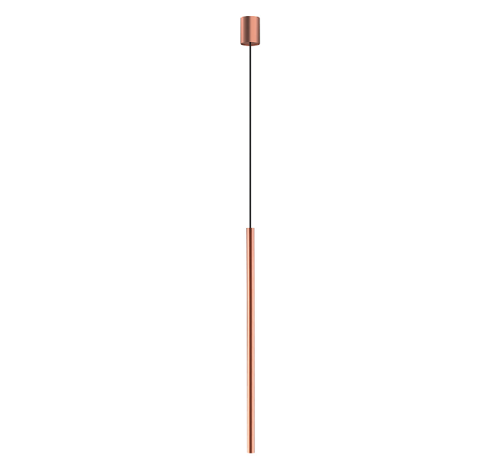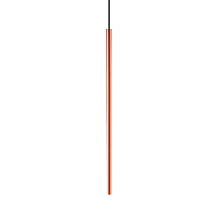 Cienka, miedziana lampa wisząca w kształcie tuby Laser o wysokości 75 cm