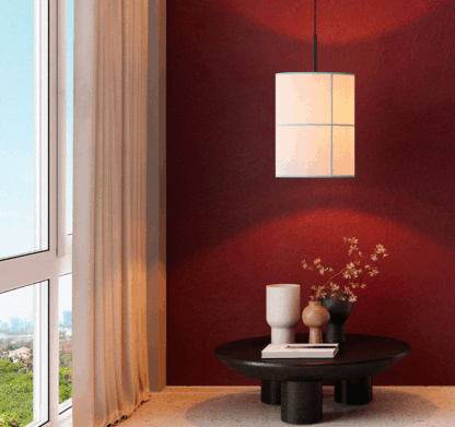 Przejdź do sklepuCylindryczna kremowa lampa wisząca Rania 38 z kratkowanym wzorem