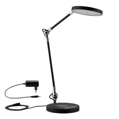 Nowoczesna, regulowana lampa biurkowa z funkcją zmiany natężenia i koloru światła. Światło można regulować płynnie lub zmieniać jego kolor w trzech poziomach - ciepły, neutralny i zimny. W podstawie lampy umieszczona jest podkładka umożliwiająca ładowanie telefonu z funkcją Qi.