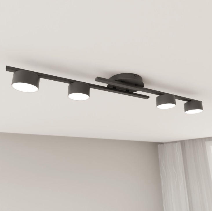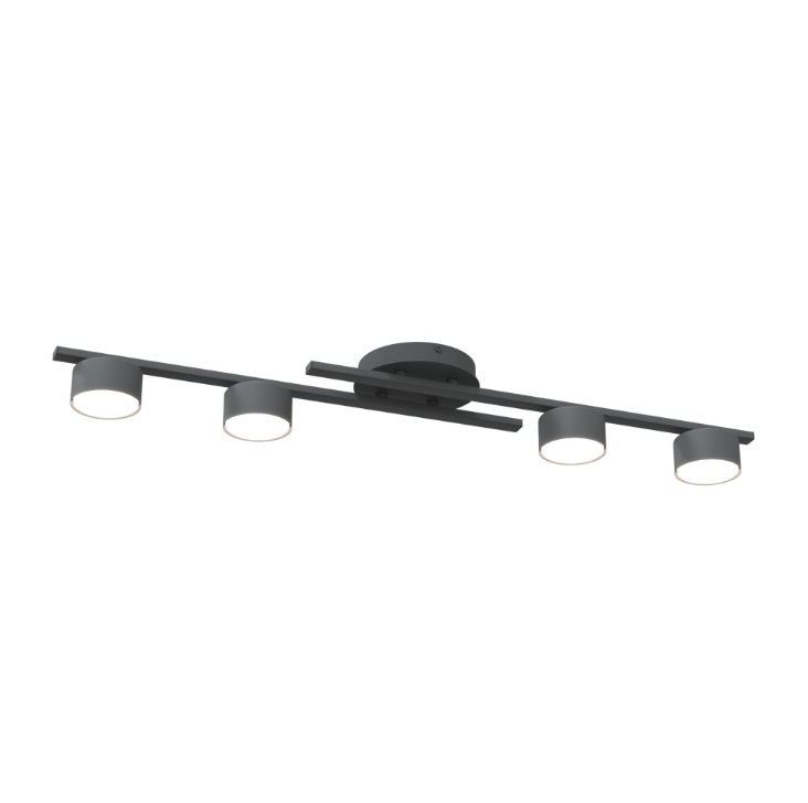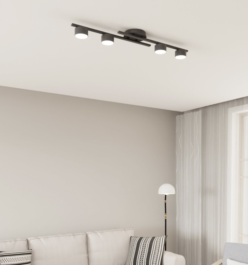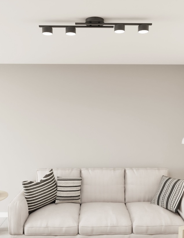 Konstrukcja oprawy bazuje na czterech źródłach światła z gwintem GX53, każde o mocy 12W. To popularne rozwiązanie stosowane w nowoczesnych lampach LED, które zapewnia płaski profil reflektorów i energooszczędność. Możliwość obracania poszczególnych punktów świetlnych pozwala na stworzenie optymalnego oświetlenia - skieruj światło tam, gdzie jest najbardziej potrzebne, czy to na blat kuchenny podczas gotowania, czy na ulubione miejsce do czytania w salonie. Matowa czerń wykończenia nie tylko nadaje lampie nowoczesny charakter, ale także eliminuje niepożądane odblaski.
