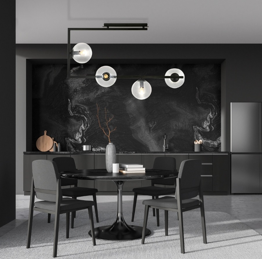 Geometryczna konstrukcja z matowego czarnego metalu układa się w wyrazisty kształt litery L, gdzie jedno ramię opada pionowo, a drugie biegnie poziomo, tworząc asymetryczną kompozycję o rozpiętości ponad 80 cm. Cztery kuliste klosze z transparentnego szkła o średnicy 15 cm odsłaniają żarówki, co oznacza, że warto dobrać dekoracyjne źródła E27 w stylu Edison, które staną się integralną częścią designu. Przezroczyste szkło nie tłumi światła ani go nie rozprasza, dlatego lampa daje otwarte, punktowe oświetlenie, które przy ciepłych żarówkach buduje nastrojowy klimat, lecz nie zastąpi jednolitego światła roboczego nad blatem. Asymetryczny układ ramion sprawia, że oprawa najlepiej prezentuje się nad stołem jadalnym o długości 120–160 cm lub jako centralny akcent w salonie i przedpokoju urządzonym w stylu loftowym bądź industrialnym.