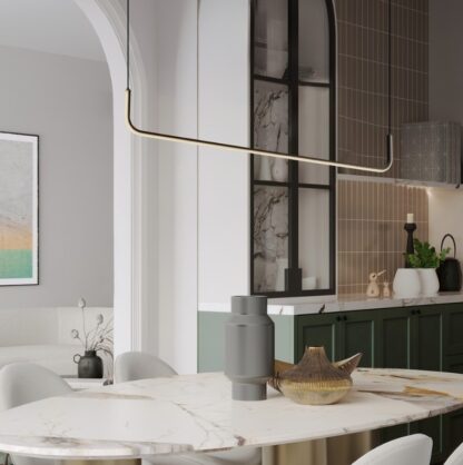 Lineform to lampa, która zachwyca swoją prostotą i funkcjonalnością. Jej wydłużony, geometryczny kształt z delikatnie zaokrąglonymi rogami nadaje wnętrzu nowoczesnego charakteru. Czarne, matowe wykończenie w połączeniu ze złotymi detalami przy zawieszeniu tworzy elegancki kontrast, który przyciąga wzrok, nie dominując przestrzeni. To oświetlenie, które idealnie wpisuje się w filozofię "less is more".