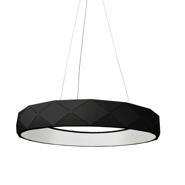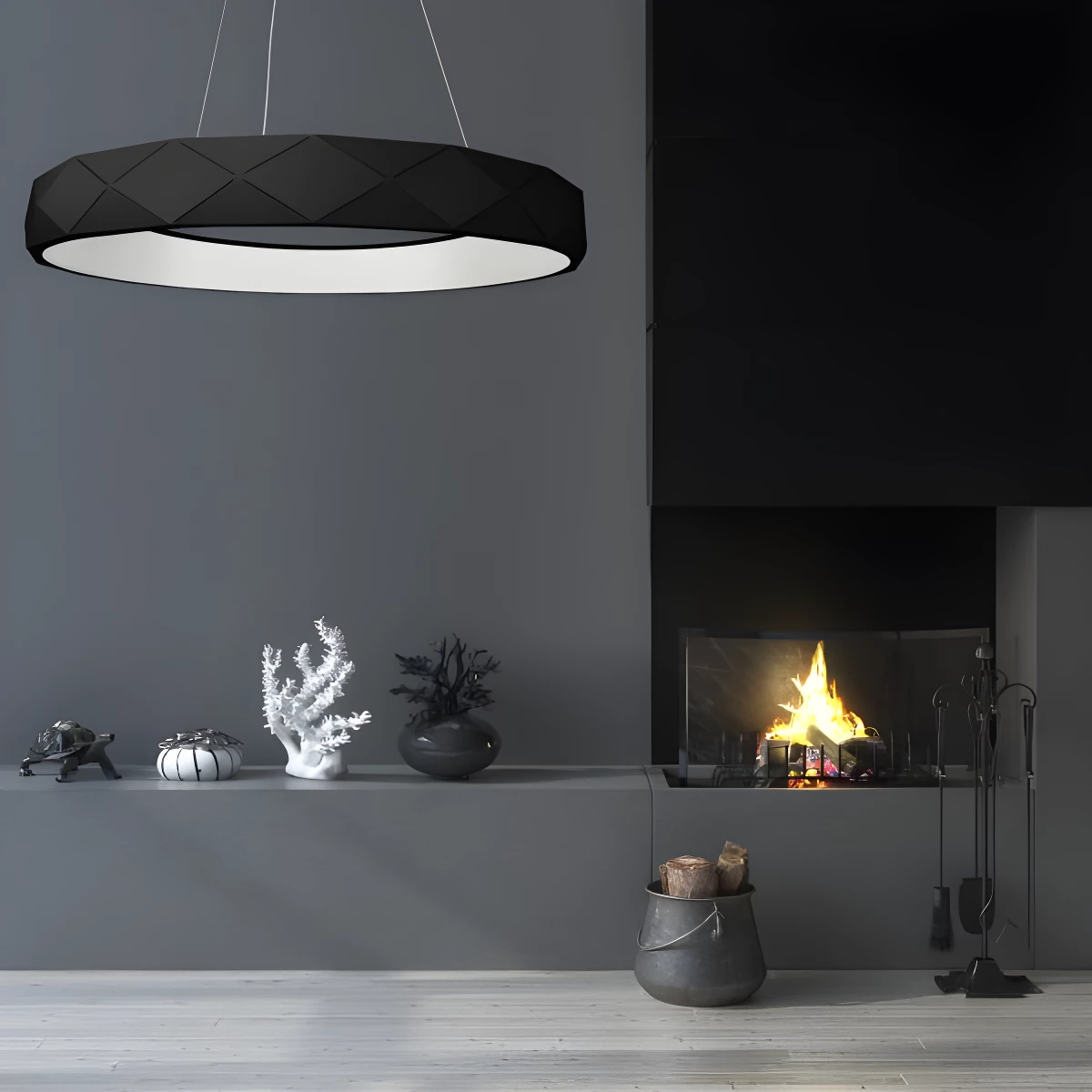 Geometryczna, czarna lampa wisząca z wbudowanym panelem LED. Model pięknie prezentuje się w nowoczesnych, minimalistycznych aranżacjach. Lampa świeci neutralnym światłem.