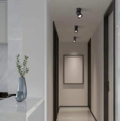 Kompaktowy, cylindryczny spot w czarnym macie, który nie przyciąga wzroku, a robi robotę. Pointa to tuba sufitowa natynkowa z ruchomą głowicą, dzięki czemu możesz skierować snop światła dokładnie tam, gdzie go potrzebujesz, na obraz w korytarzu, klamkę drzwi czy buty przy wejściu. Na zdjęciu widać, że kilka takich opraw zamontowanych w linii wzdłuż wąskiego przejścia tworzy rytmiczne, punktowe doświetlenie, które nadaje korytarzowi głębi zamiast płaskiego, nudnego oświetlenia z jednego plafoniera. Trzonek GU10 daje swobodę wyboru żarówki, możesz wstawić ciepłe 2700K do nastrojowego holu albo neutralne 4000K przy lustrze w przedpokoju. Światło jest kierunkowe, skupione w wąski stożek, więc tuba sprawdza się jako oświetlenie akcentowe, ale nie rozświetli całego pomieszczenia samodzielnie. Klasa IP20 oznacza montaż w suchych pomieszczeniach, czyli korytarz, salon lub sypialnia, natomiast nie do łazienki. Szczegółowe parametry techniczne znajdziesz w tabelce poniżej.