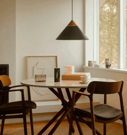 Czarna wisząca lampa Kinto 42 w kształcie stożka z drewnianym akcentem