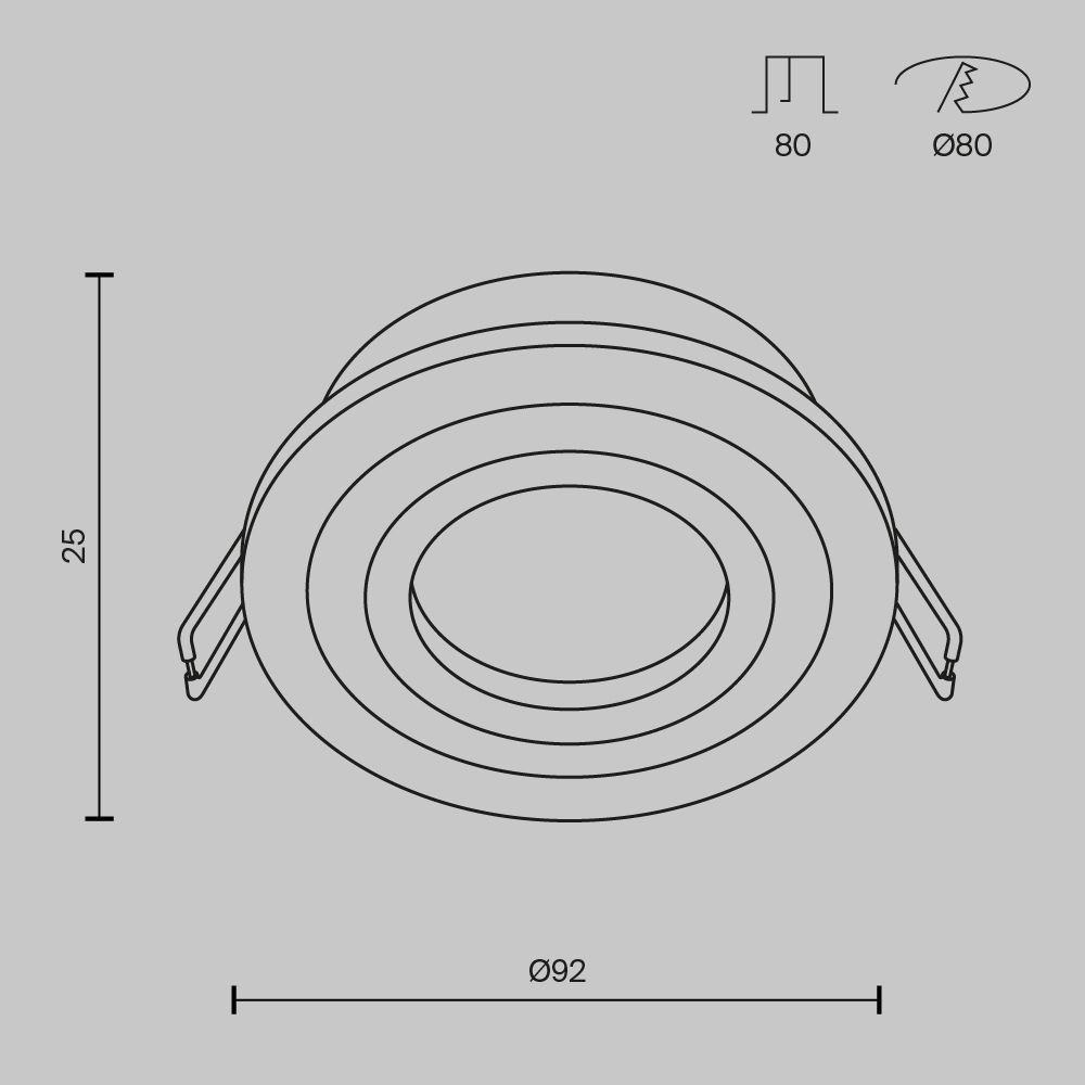 • Wymiary: Ø 9,2 cm × wys. 2,5 cm; otwór montażowy Ø 8 cm; minimalna głębokość zabudowy 8 cm.