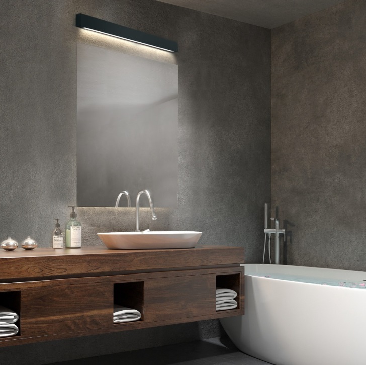 Czarny kinkiet łazienkowy LED Ibros o podłużnym kształcie i klasie szczelności IP44