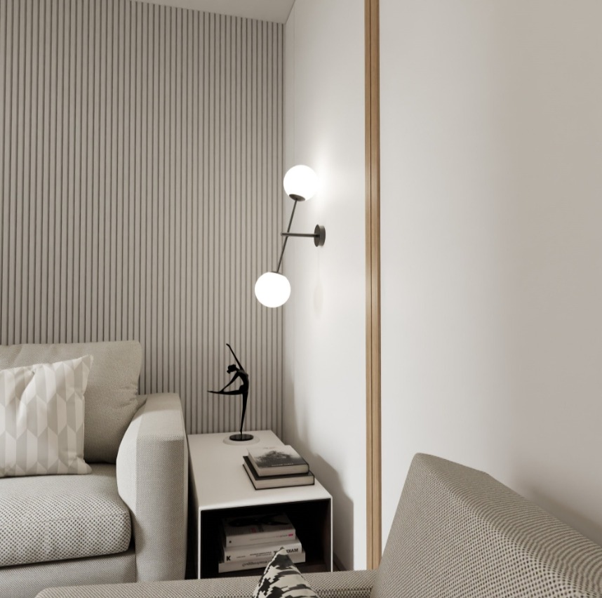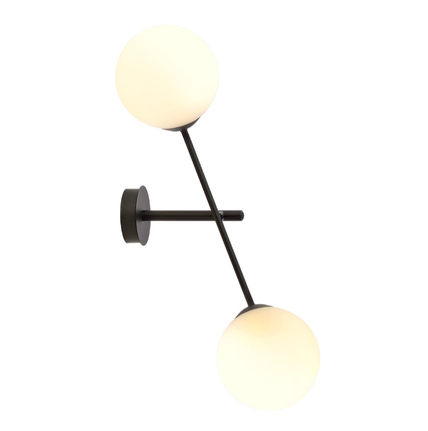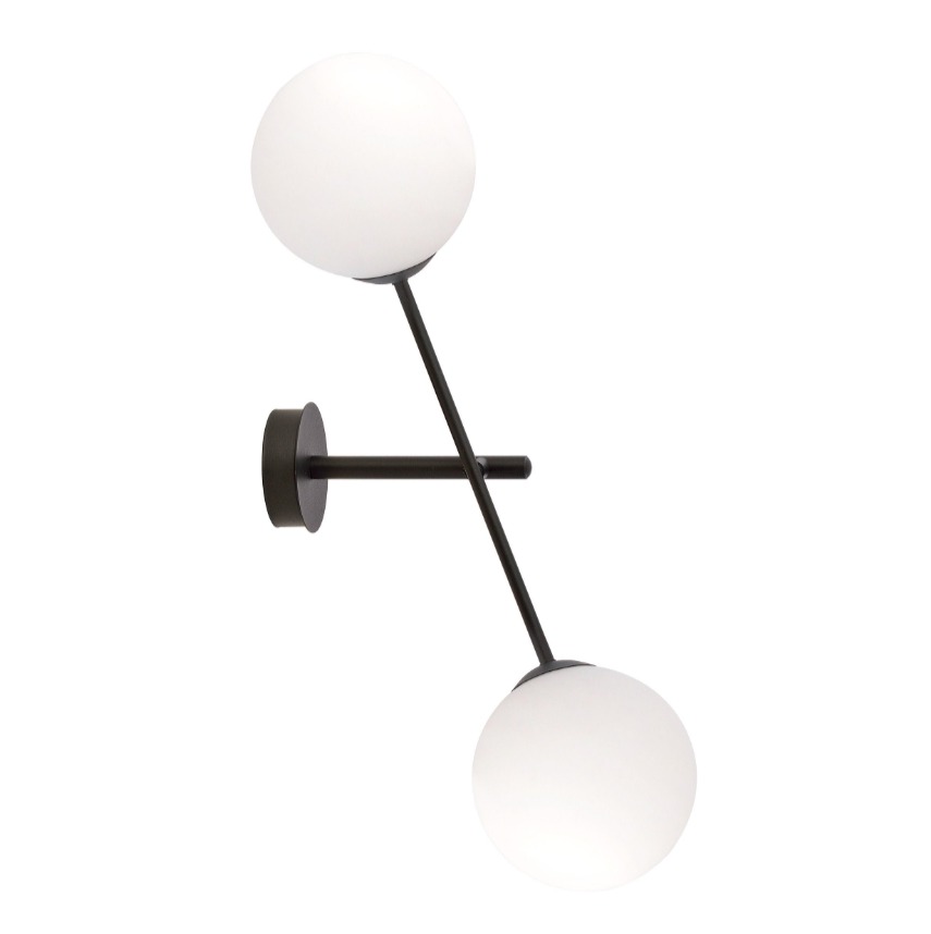 Minimalistyczny, czarny metalowy kinkiet o prostej formie z dwiema mlecznymi, szklanymi kulami. Dobrze sprawdzi się obok lustra, nad kanapą albo jako para po obu stronach łóżka. Wyprodukowano w Polsce.Zapytaj o ten produkt