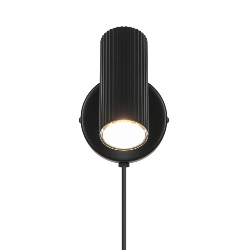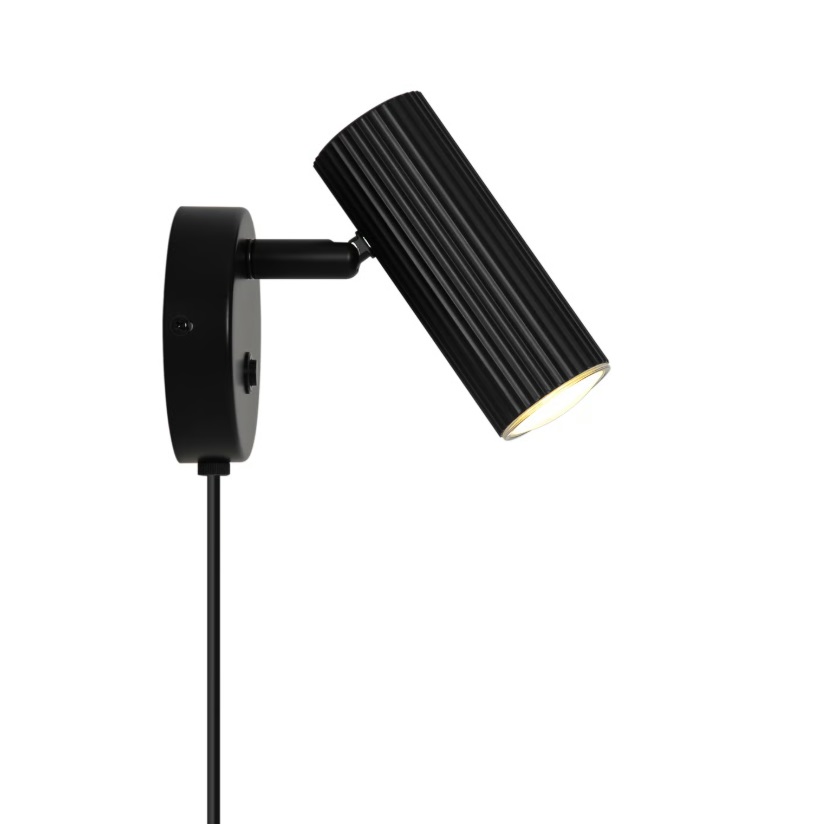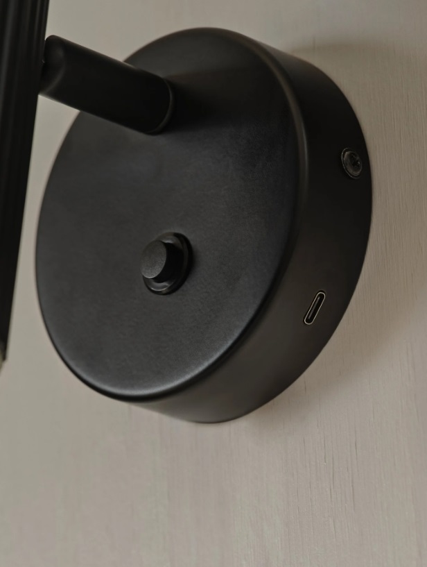Kinkiet Vico w wykończeniu matowej czerni z charakterystycznym ryflowaniem na kloszu. Pionowe żłobienia nadają mu nowoczesny charakter, który dobrze współgra ze współczesnymi i minimalistycznymi sypialniami. Głowica obraca się w zakresie 320° w poziomie i 90° w pionie, dzięki czemu snop światła możesz precyzyjnie nakierować na książkę lub odciągnąć od osoby śpiącej obok. Niewielkie wymiary sprawiają, że kinkiet nie dominuje nad stolikiem nocnym, a wbudowany port USB w podstawie pozwala ładować telefon bez szukania wolnego gniazdka. Oprawa wyposażona jest we włącznik umieszczony na okrągłej rozecie. Przewód zasilający można odłączyć i podłączyć kinkiet bezpośrednio do instalacji elektrycznej w ścianie, co daje czysty, hotelowy efekt bez widocznych kabli.Zapytaj o ten produkt