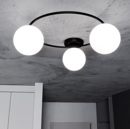 Sopra 3 to plafon, który zachwyca swoją przemyślaną geometrią. Trzy idealnie białe, szklane kule o średnicy 15 cm każda, rozmieszczone symetrycznie na czarnej, metalowej obręczy, tworzą harmonijną kompozycję przypominającą konstelację gwiazd. Matowa powierzchnia opalowego szkła nadaje kloszom delikatny, satynowy połysk, który pięknie kontrastuje z głęboką czernią podstawy.