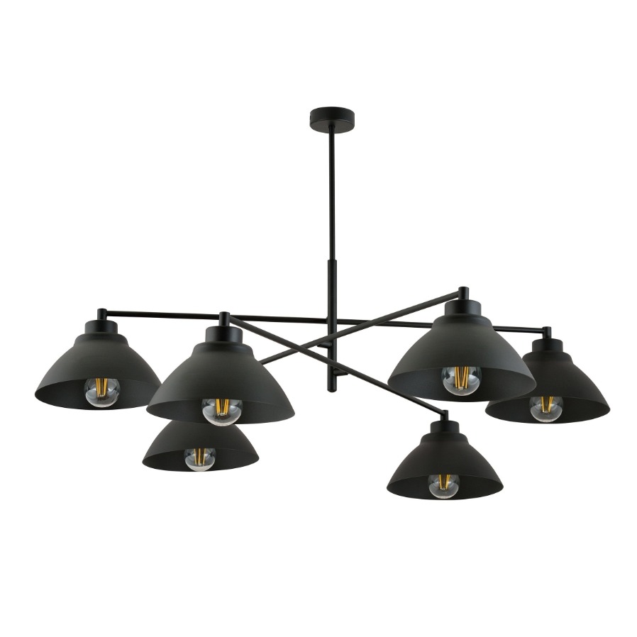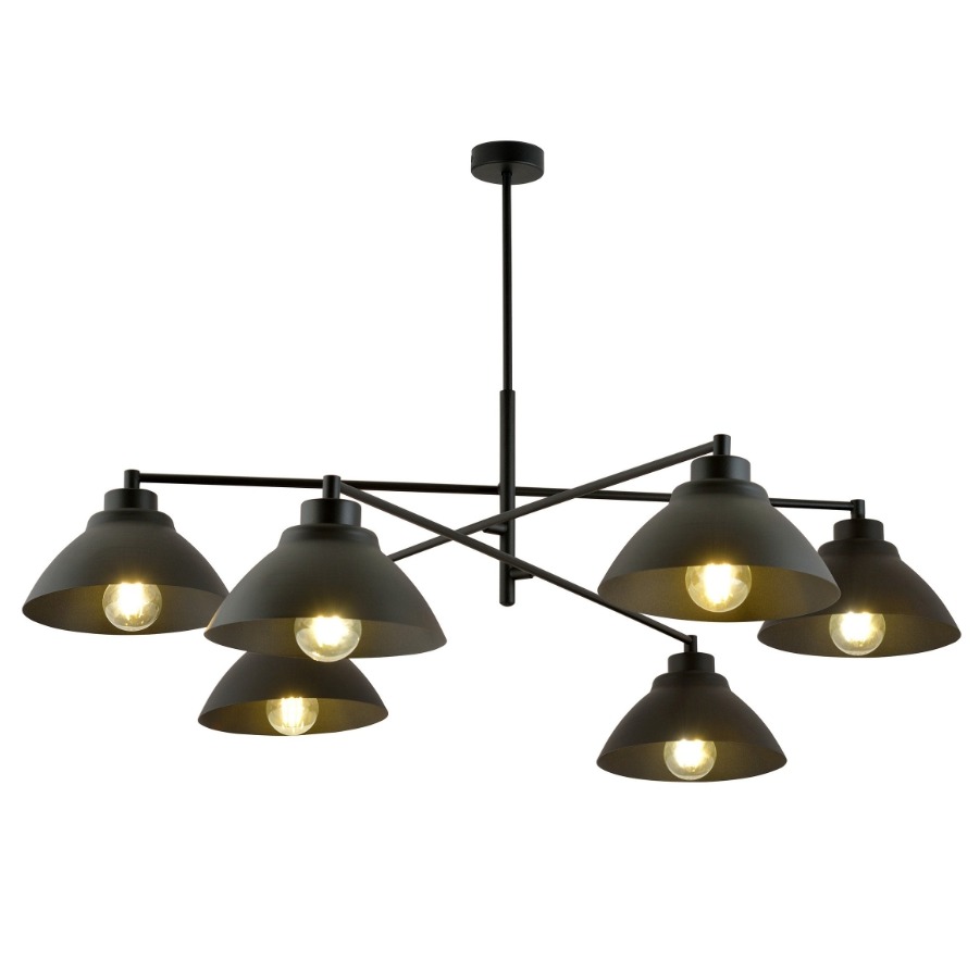 Żyrandol posiada sześć, czarnych metalowych kloszy kształtem przypominającym rozchylone stożki skierowane w dół. Otwarte od dołu klosze nie mają dyfuzora, więc żarówka jest widoczna, a warto tu postawić na dekoracyjne filamentowe globe, które podkręcą industrialny charakter lampy. Podsufitka ma średnicę 8 cm.