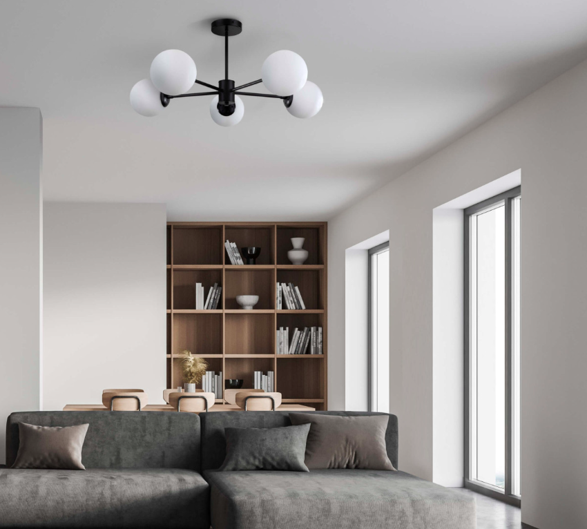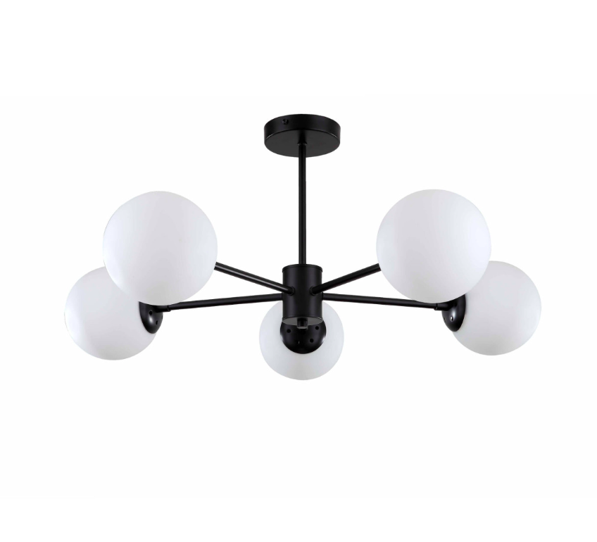 Czarny żyrandol Roma z pięcioma opalowymi szklanymi kulami do sypialni