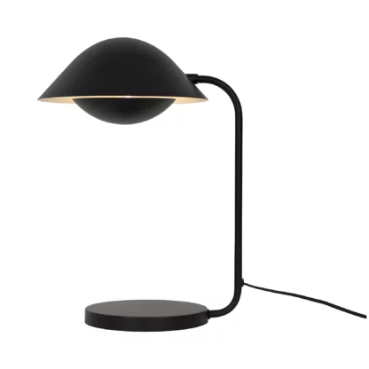 Minimalistyczna lampa stołowa z osłoniętą żarówką, do wnętrz skandynawskich i nowoczesnych. Owalny, czarny klosz skrywa żarówkę - światło jest dyskretne i delikatne.