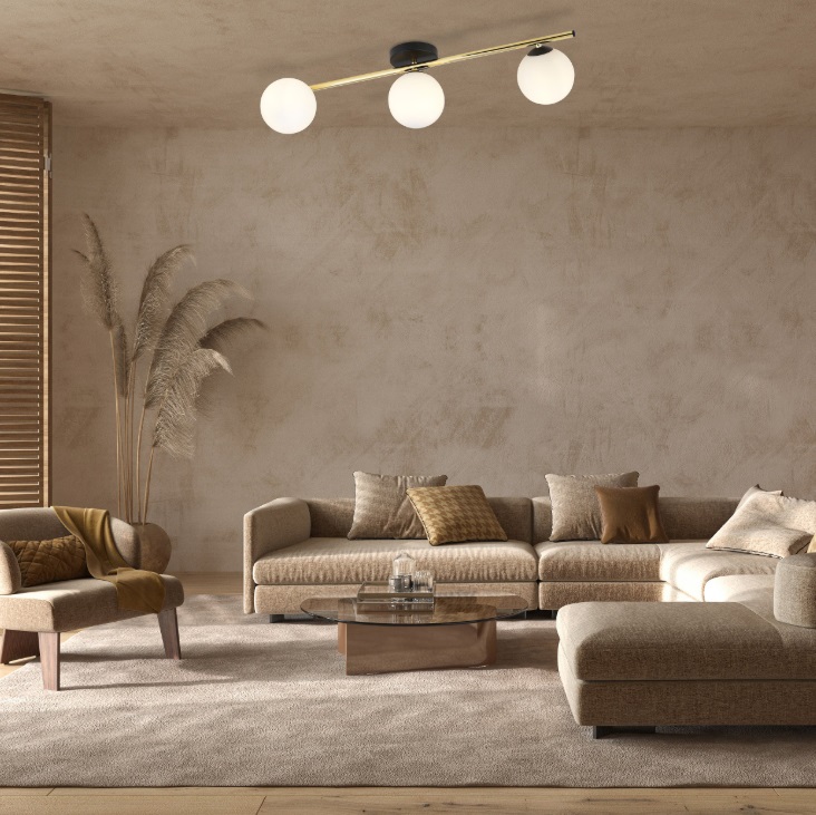 Splendi 3 to prawdziwy kameleon wśród lamp sufitowych. Podczas testów zachwyciła mnie jakość wykonania - matowa czerń podstawy kontrastuje z ciepłym, złotym wykończeniem listwy, tworząc kompozycję, która przyciąga wzrok, ale nie dominuje przestrzeni. Mleczne klosze o średnicy 15 cm delikatnie rozpraszają światło, tworząc przyjemną, nieoślepiającą poświatę idealną do codziennych aktywności.