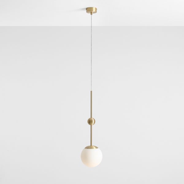 Lampa wisząca Mae wykonana jest z mosiądzu i szkła w jasnozłotym wykończeniu z białym kloszem. Szklana kula osadzona na smukłym ramieniu z dekoracyjną mosiężną kuleczką miękko rozprasza światło nad stołem, w jadalni lub nad wyspą kuchenną. Kluczowe wymiary (wys. 250 cm × szer. 16 cm × dł. 16 cm) ułatwiają zaplanowanie zawieszenia w wysokich wnętrzach lub w szeregu kilku opraw. E27 (maks. 60 W) oraz IP20 — do wnętrz suchych.