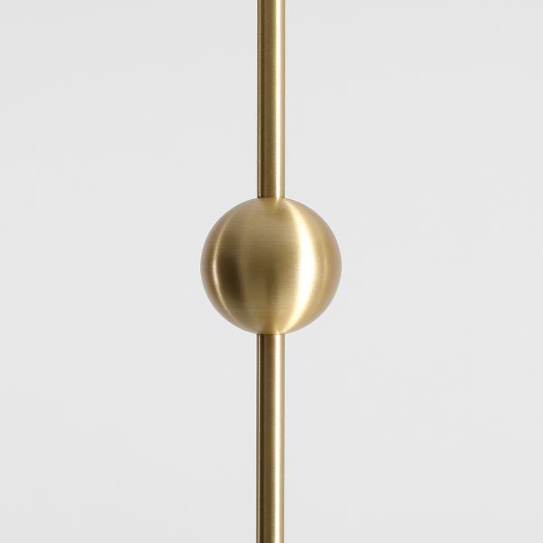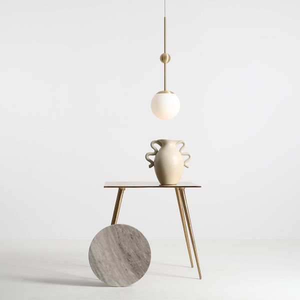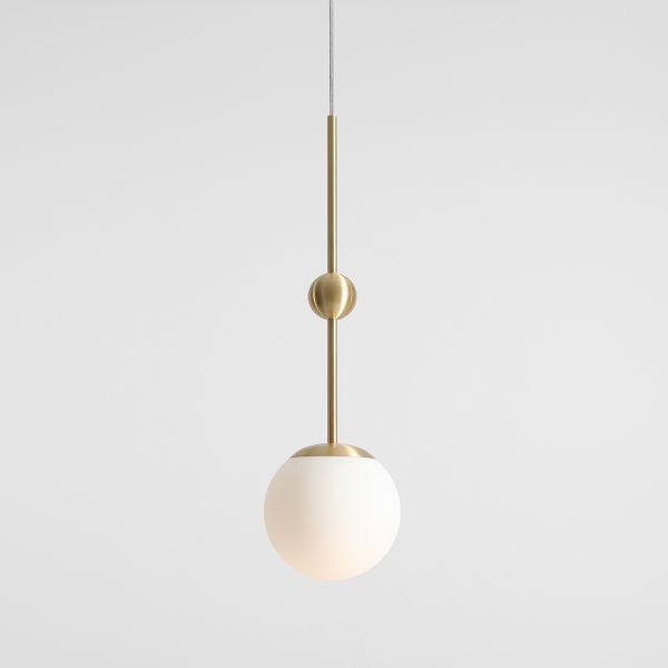 • Biżuteryjna mosiężna kulka, szkło z Polskiej Huty Szkła równomiernie rozpraszające światło oraz możliwość regulacji wysokości przez elektryka — dopracowany detal i zawieszenie dopasowane do stołu lub blatu.