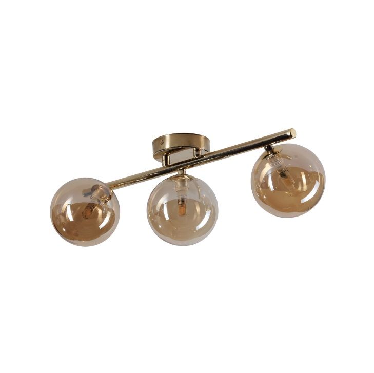 Elegancka złota lampa sufitowa Estera z trzema bursztynowymi kloszami