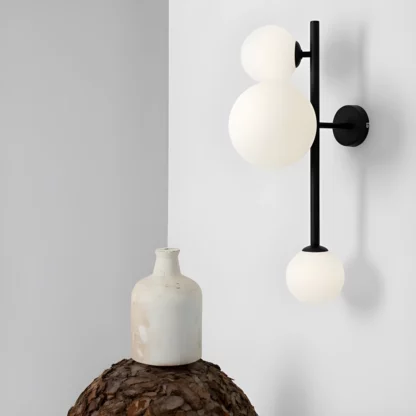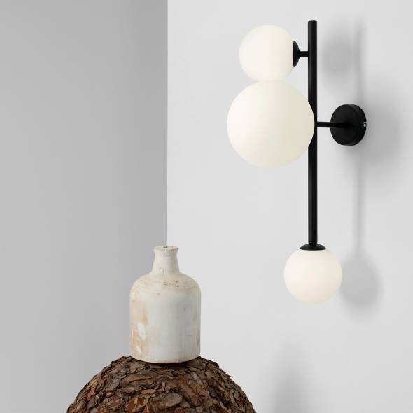 Kinkiet Dione to trzy mleczne klosze różnej wielkości, które wspaniale komponują się z czarna podstawą. Dzięki białemu szkłu, światło delikatnie się rozprasza i jest przyjemne dla oczu. Kinkiet idealny do sypialni, salonu lub przedpokoju. Lampę można wykorzystać także w montażu sufitowym.