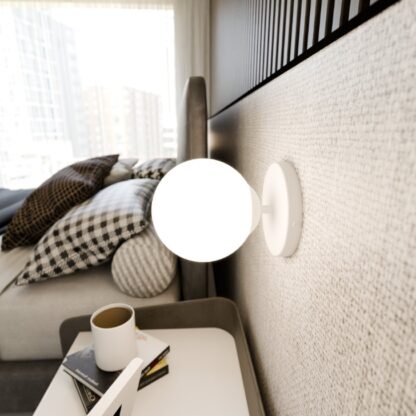 Testując kinkiet Bior, od razu zwróciłem uwagę na jego elegancką prostotę. Mlecznobiała szklana kula o idealnie gładkiej powierzchni przypomina księżyc w pełni - delikatnie świeci, nie oślepiając. Metalowa podstawa w matowej bieli sprawia wrażenie solidnej, a jednocześnie wizualnie lekka konstrukcja nie przytłacza ściany. To jeden z tych kinkietów, które wyglądają równie dobrze włączone, jak i wyłączone.