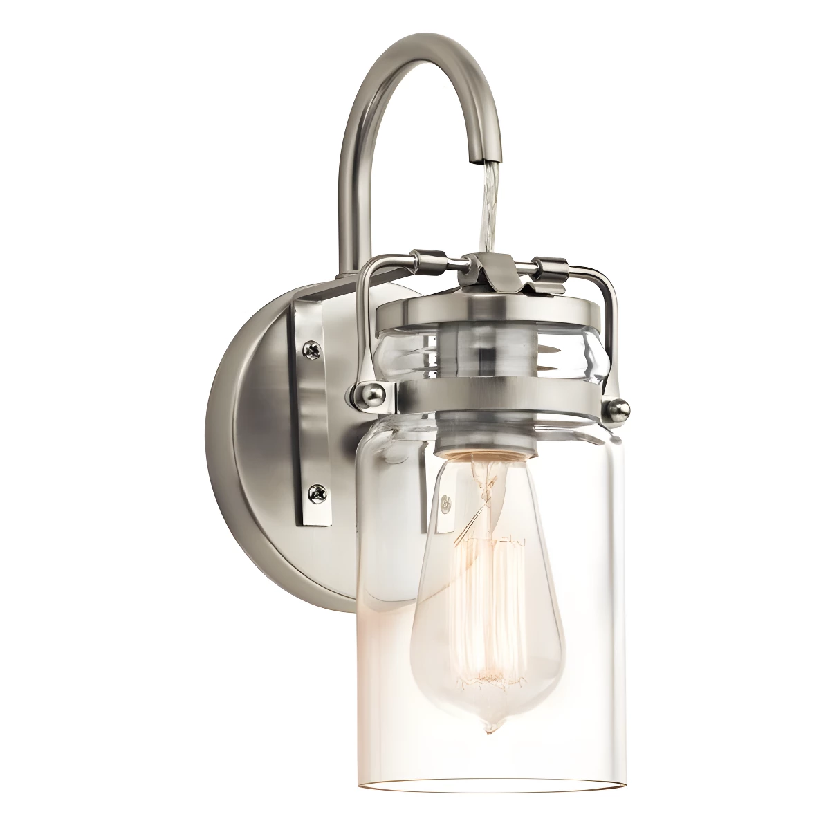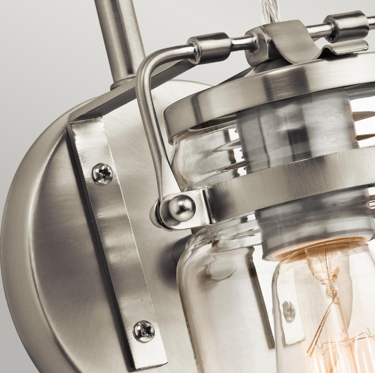 Kinkiet Brinley łączy przezroczysty, szklany klosz inspirowany słoikami z wykończeniem w kolorze szczotkowanego niklu, dając nastrojowe, dekoracyjne światło bez olśnienia. Kluczowe wymiary (wys. 29,2 cm × szer. 12,7 cm × gł. 15,9 cm) ułatwiają montaż obok lustra lub nad komodą. gwint E27 (maks. 60 W) oraz IP20 — do wnętrz suchych.