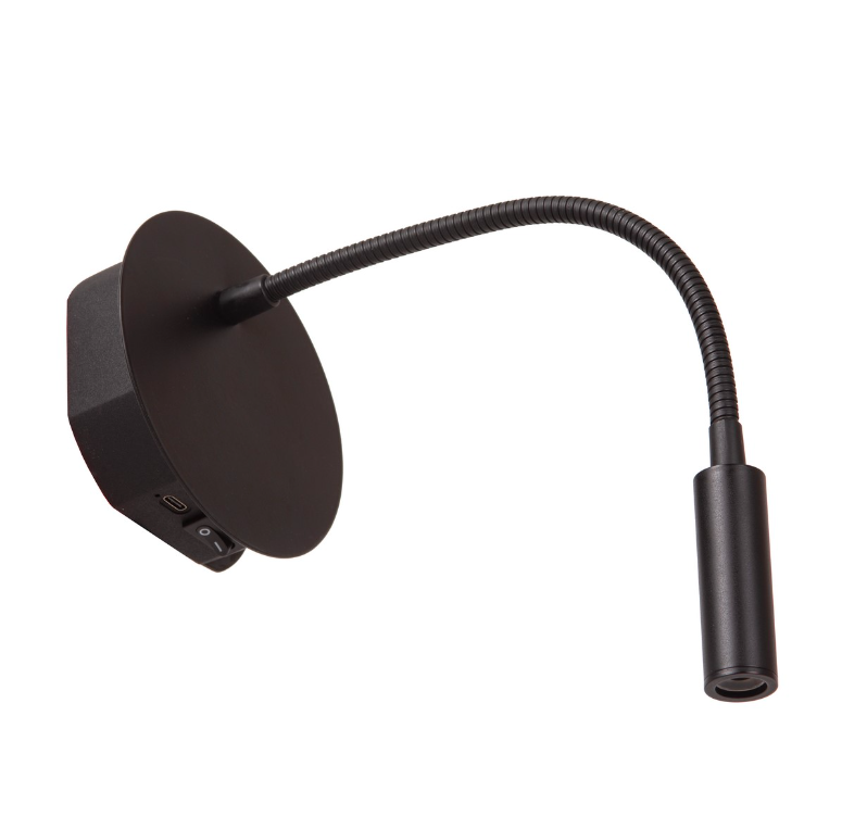 Kinkiet Jolijn LED w kolorze czarnym z elastycznym ramieniem, portem USB-C i włącznikiem