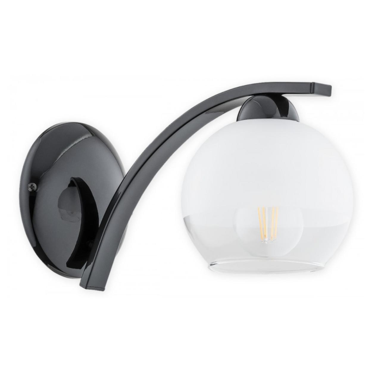 Oprawa łączy metalową konstrukcję w czarnym połysku z kulistym kloszem ze szkła, w którym mleczna góra płynnie przechodzi w transparentny dół, odsłaniając żarówkę w dolnej części. Łukowate ramię kieruje klosz w dół i na bok, dając miękkie światło rozproszone od góry i wyraźniejszy akcent pod kloszem. Sprawdzi się jako dodatkowe oświetlenie w salonie, sypialni lub korytarzu.