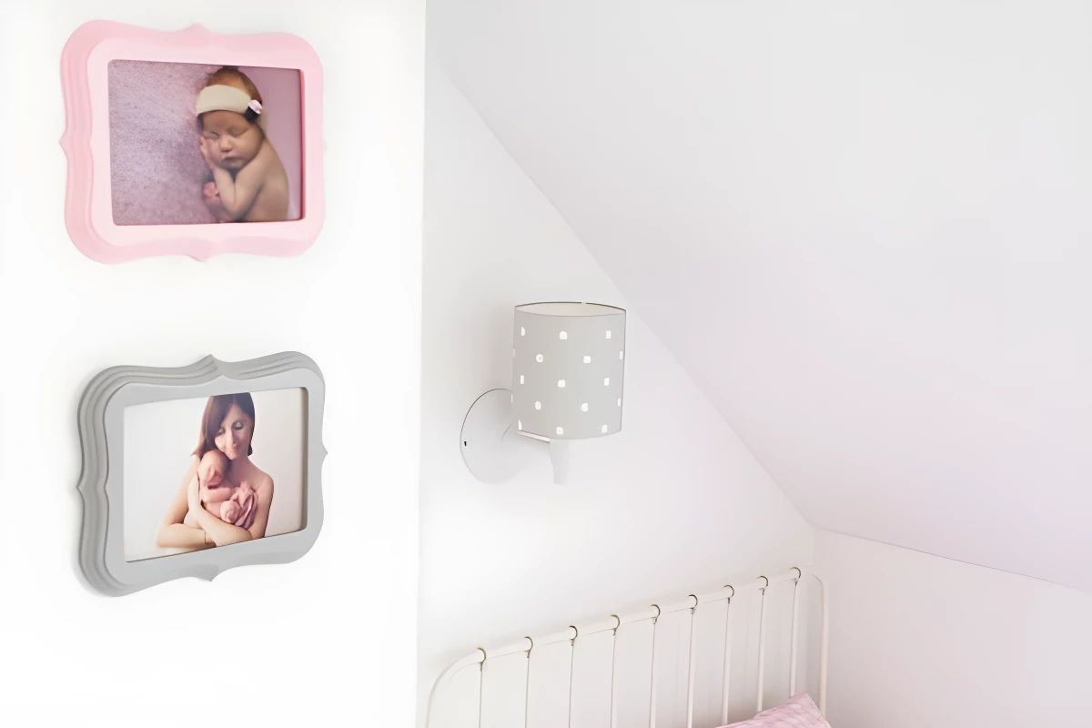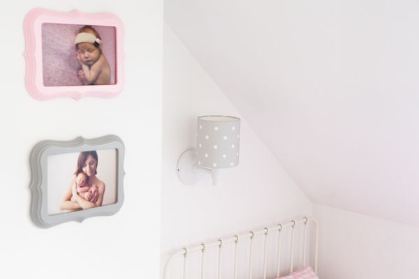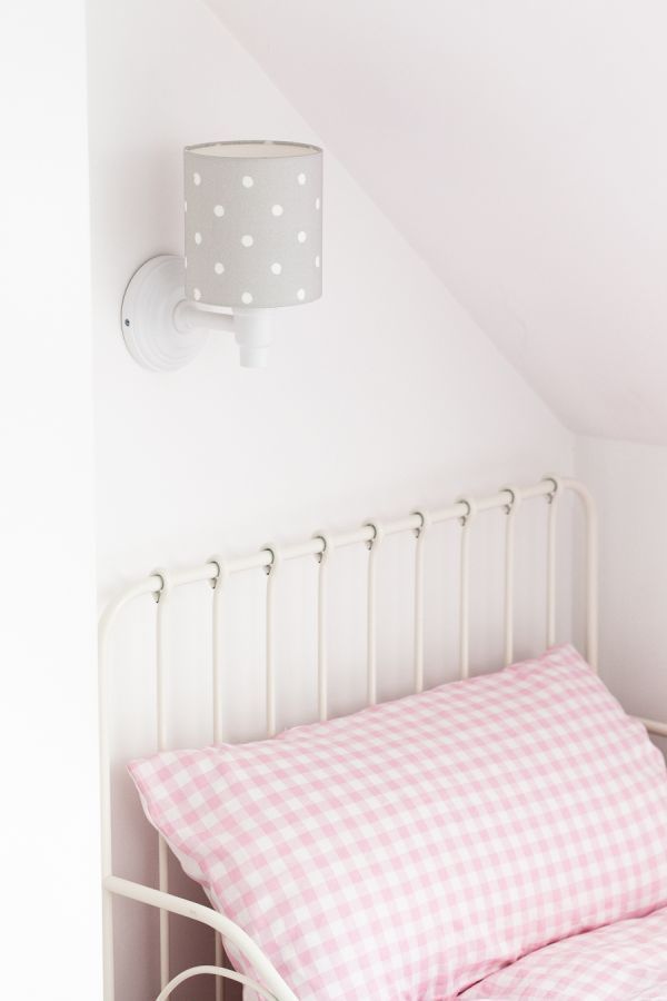 Nowatorski egzemplarz kinkietu do takich pomieszczeń jak pokój dziecięcy - od sprawdzonego producenta Lamps&Co. Charakterystyka lampy: numer katalogowy LOVELY DOTS GREY WL, wykonanie - białe drewno, bawełna, dodatkowe informacje - z abażurem.