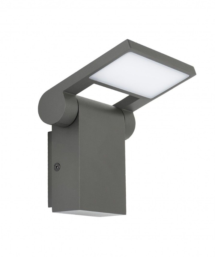 Kinkiet o antracytowej, matowej obudowie z malowanego proszkowo aluminium, z płaską, prostokątną głowicą i mlecznym dyfuzorem z poliwęglanu kierującym światło w dół. Ruchoma głowica pozwala dopasować kąt świecenia, a klasa IP54 i barwa 3000K predysponują oprawę do montażu przy wejściu, na tarasie lub balkonie.