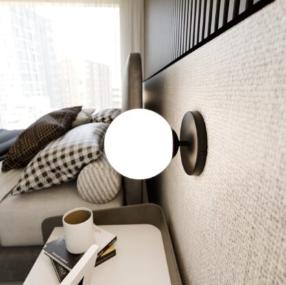 Kinkiet Bior zachwyca prostotą, która kryje w sobie przemyślane detale. Podczas testów zwróciłem uwagę na idealnie gładką powierzchnię czarnej podstawy - matowe wykończenie nie tylko pięknie prezentuje się w świetle dziennym, ale także skutecznie maskuje odciski palców. Kulisty klosz wykonany z mlecznego szkła tworzy subtelny kontrast, nadając całości lekkości i nowoczesnego charakteru.