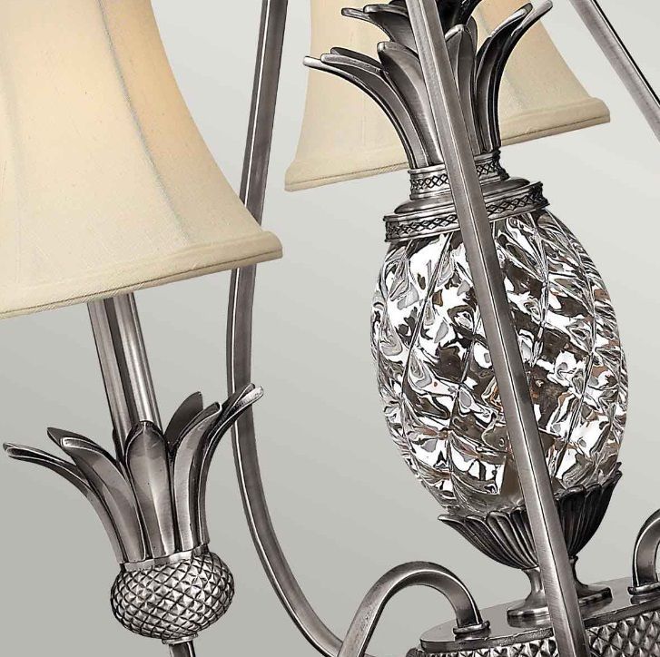 Klasyczny żyrandol Plantation w niklowanym wykończeniu z siedmioma abażurami w odcieniu kości słoniowej