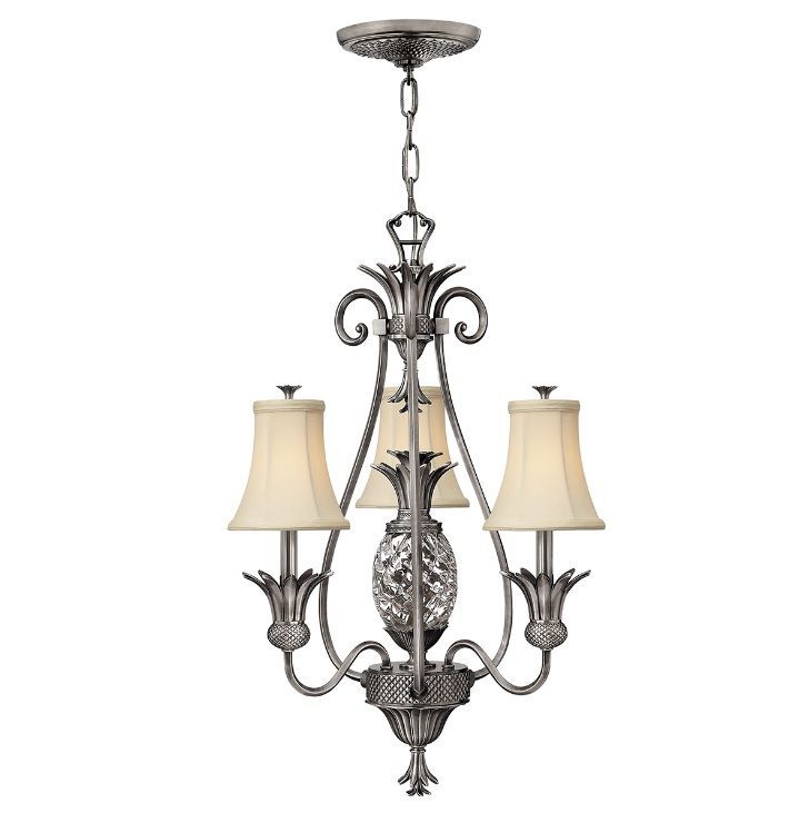 Klasyczny, srebrny żyrandol Plantation z trzema punktami świetlnymi i abażurami