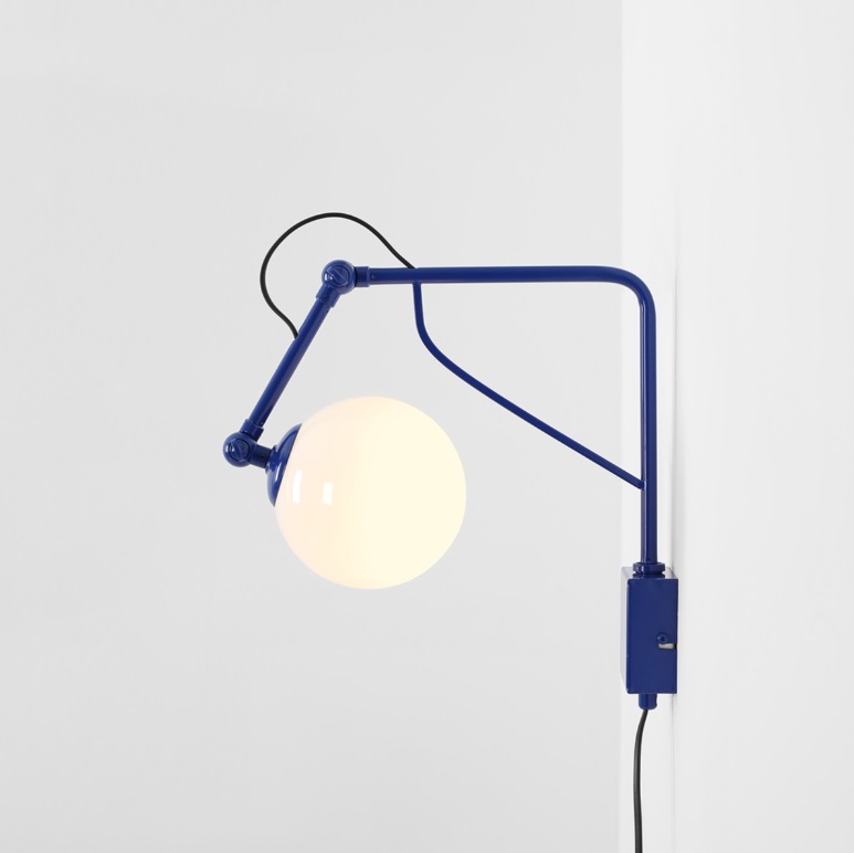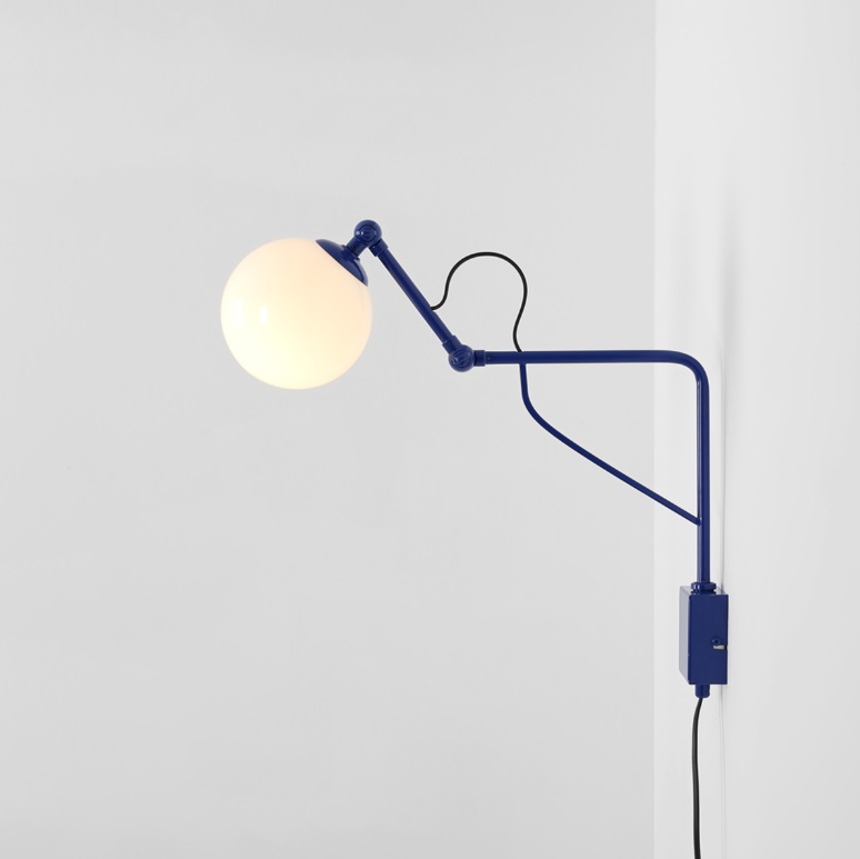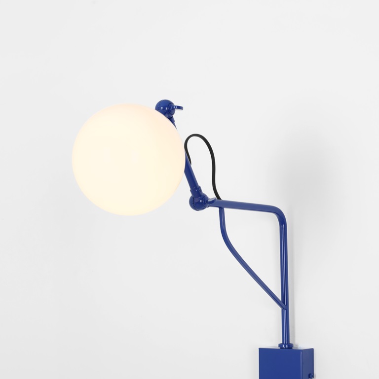 Krótki kinkiet Soho Glass z kobaltowym kloszem i kulistym wysięgnikiem do sypialni