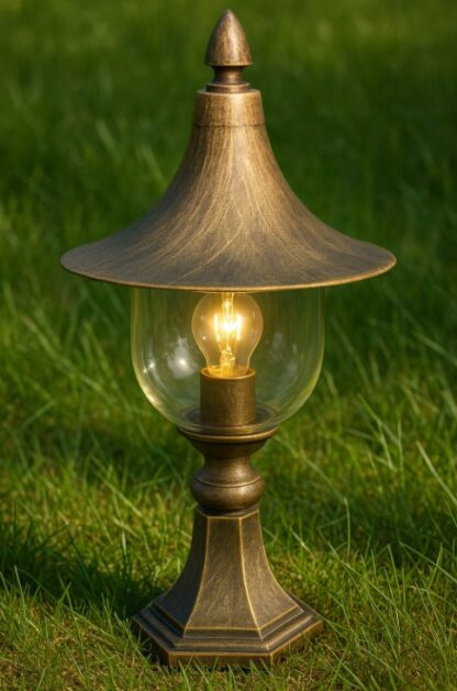 - Stylowa lampa ogrodowa w kształcie klasycznej latarni z szerokim, stożkowym kloszem