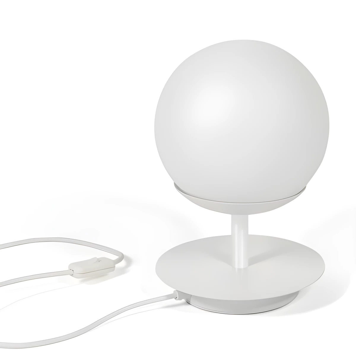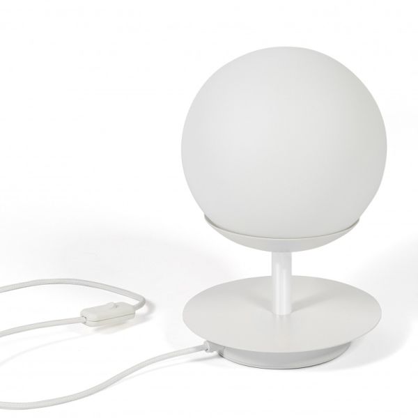 Biała lampa stołowa Plaat to przede wszystkim piękny, szklany klosz o białej barwie, umieszczony na równie białej podstawie. Prosta, ale niezwykle elegancka lampka sprawdzi się na szafce w salonie lub szafce nocnej w sypialni.  Włącznik on/off umieszczony jest na przewodzie.