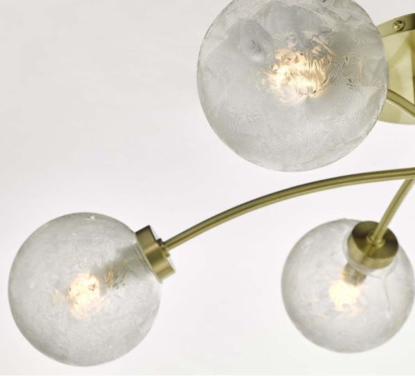 Lampa Avari z piękną, złotą podstawa, która idealnie komponuje się ze szklanymi kloszami. Cudowny dodatek do każdej nowoczesnej, jasnej kuchni i nie tylko. Klosze wykonane zostały z efektem kryształków lodu, co dodaje jej oryginalności.