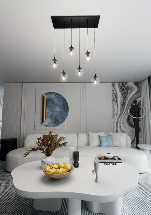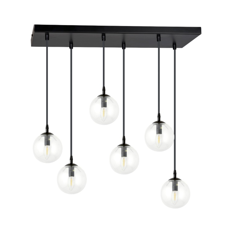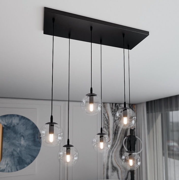 Cosmo 6 to żyrandol, który urzeka harmonijnym połączeniem industrialnej elegancji z subtelną lekkością. Matowa, czarna belka sufitowa kontrastuje z delikatnymi, przezroczystymi kloszami, tworząc kompozycję pełną wdzięku. Każdy z sześciu szklanych kloszy zawiesza się na cienkim, czarnym przewodzie, nadając całości dynamiczny, przestrzenny charakter. To rozwiązanie, które testowałem osobiście – gładkość szkła w połączeniu z minimalistyczną formą oprawy tworzy wyjątkowy efekt wizualny.