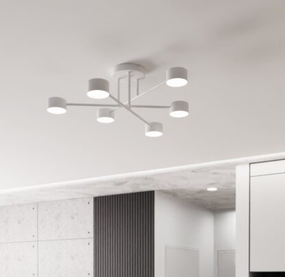Halo 6 to plafon, który od pierwszego spojrzenia zachwyca swoją przemyślaną geometrią. Sześć cylindrycznych opraw rozmieszczonych symetrycznie na metalowych ramionach tworzy harmonijną kompozycję, która przypomina nowoczesną interpretację kandelabru. Matowa, biała powłoka nadaje całości lekkości i sprawia, że lampa doskonale komponuje się zarówno z białymi, jak i kontrastowymi sufitami.