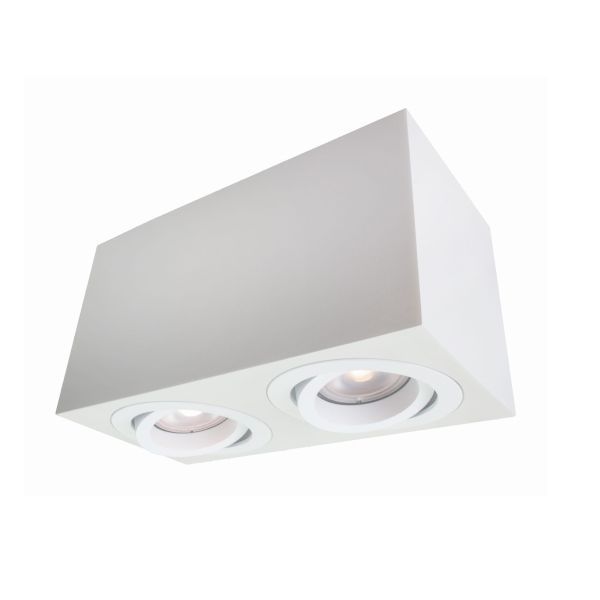 Prostokątna lampa sufitowa w kolorze białym. Spot posiada dwa regulowane źródła światła. Spot można umieścić w korytarzu, holu lub w przedpokoju.