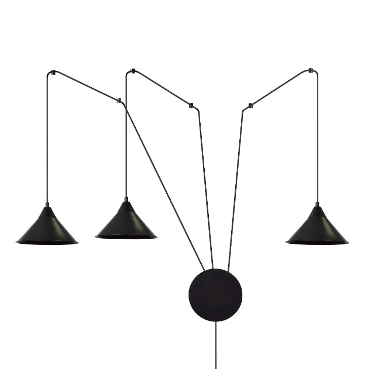 - ✓ Stożkowe klosze w matowej czerni kierują światło punktowo w dół, tworząc przytulne strefy oświetlenia bez oślepiania
