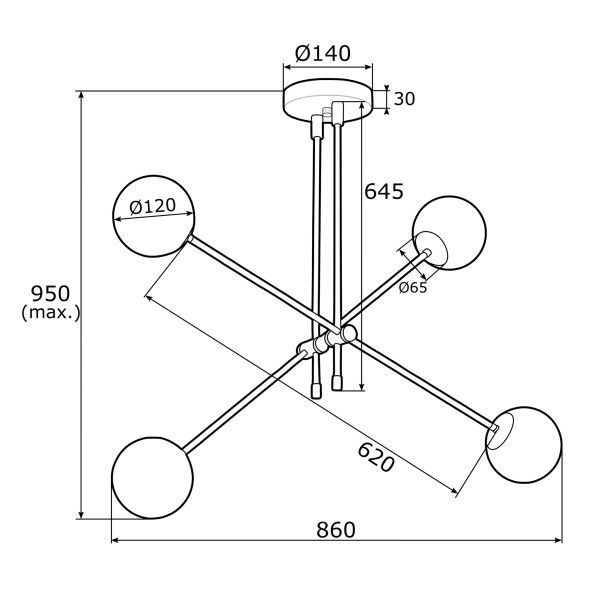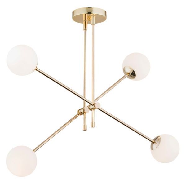 Lampa Abstract ze złotym stelażem, na którym zamocowane są cztery mleczne kule. Klosze fantastycznie rozpraszają światło, a dodatkowo wspaniale komponują się ze złotym kolorem. Lampa doda elegancji każdemu pomieszczeniu.