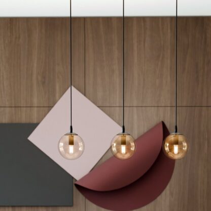 • Trzy szklane klosze w ciepłym, miodowym odcieniu tworzą harmonijną kompozycję świetlną