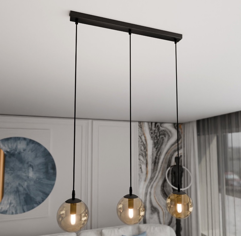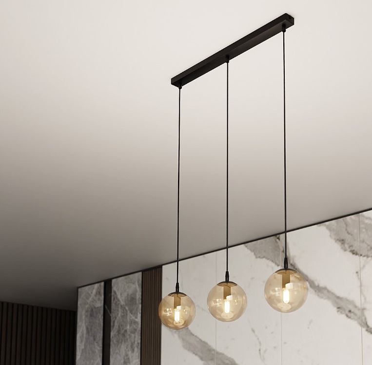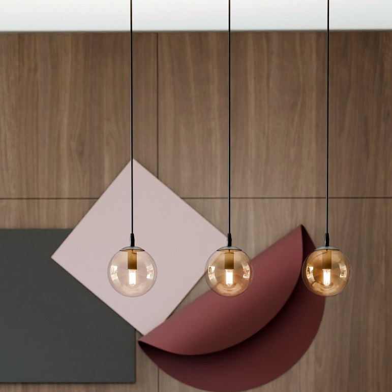 Pierwszym, co zwróciło moją uwagę podczas testowania Cosmo 3, był niezwykły efekt świetlny tworzony przez miodowe szklane kule. Delikatnie przyciemnione szkło rozprasza światło, tworząc ciepłą, przyjemną poświatę bez efektu oślepiania. Czarne, minimalistyczne zawieszenia podkreślają nowoczesny charakter lampy, a ich smukła linia optycznie podnosi sufit.