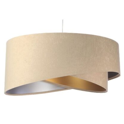 Galaxy to cudowna lampa z welurowymi, beżowymi kloszami. Większy abażur ma środek srebrny, a mniejszy złoty. Obydwa wykonane są z tworzywa PCV. Wszystko z wysokiej jakości materiałów, które są odporne na promienie UV więc tkanina nie ulegnie wyblaknięciu.