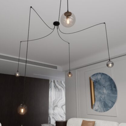 - Elastyczne zawieszenie typu "pająk" pozwala dowolnie aranżować wysokość i rozstaw kloszy