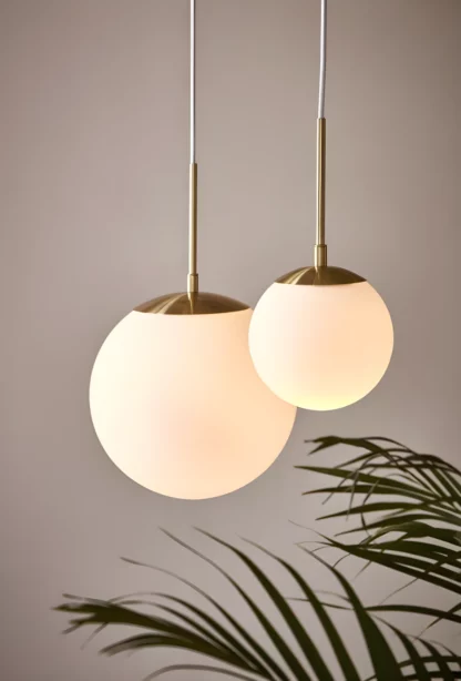 Lampa wisząca Grant 25 to mleczna kula, której elegancji dodaje złote zawieszenie. Klosz fantastycznie rozprasza światło, dlatego idealnie wpasuje się do sypialni lub kuchni. Lampa dostępna jest w kilku rozmiarach, co pozwala na tworzenie ciekawych aranżacji.