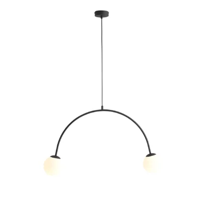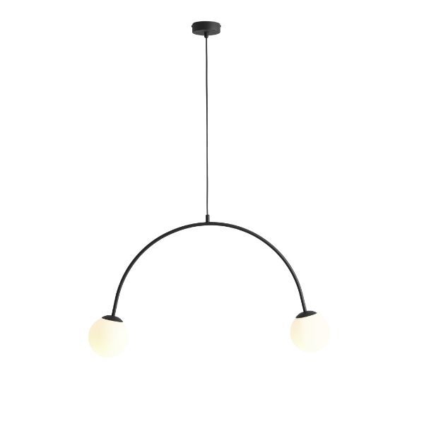 Lampa z limitowanej kolekcji oświetlenia ARTERA & ARDANT. Czarny łuk zakończony mlecznymi kloszami o średnicy 14 cm. Z lampą Lea stworzysz efektowną aranżację w salonie, czy jadalni.